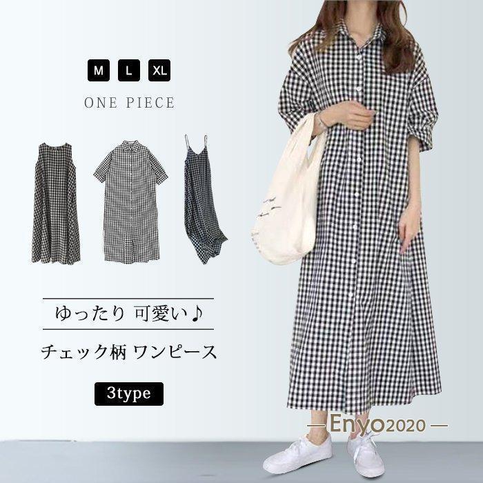 夏ワンピースチェック柄 ギンガムチェック ロングシャツ 3typeレディースファッション ワンピース
