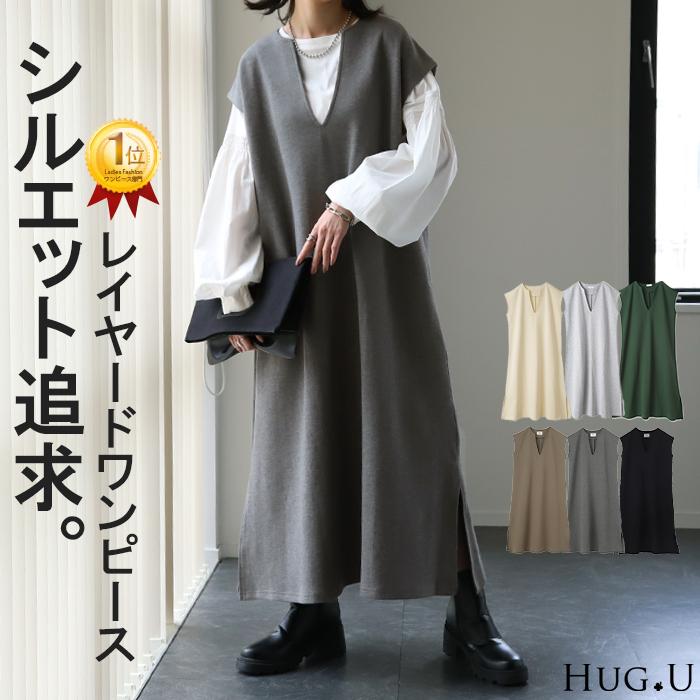 ワンピース レディース ネック 深い シンプル バックスリット 軽量 すっきり 高見え ゆったり 体型カバー 着痩せ 華奢 オールシーズン