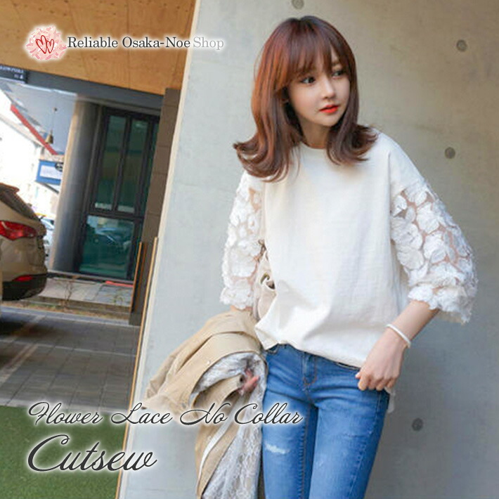 袖に施された花柄レース刺繍が♪白の七分袖カットソー Tシャツ レディース トップス ブラウス シャツ フラワー レトロ 森ガール 透け 半袖 ロング 夏 春 秋 春夏