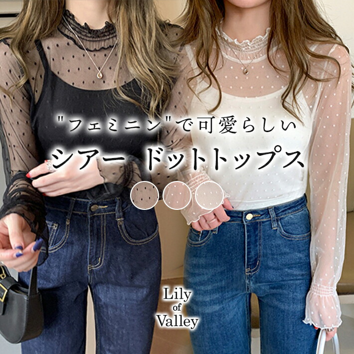 フェミニンで可愛らしい印象の ボトルネック シアー ドット トップス レディース 清楚 インナー レース 水玉 カットソー 薄手 シースルー オフィスカジュアル ハイネック 韓国