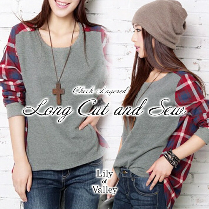 1枚で今っぽコーデの完成♪チェック 切り替え ロングスリーブ カットソー シャツ ドッキング 秋 冬 大きいサイズ カジュアル 春 起毛 ロング Tシャツ 七分袖 トレーナー スウェット