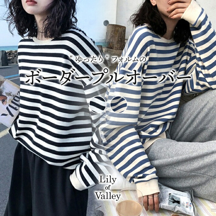 ゆったりフォルムが今年らしい オーバーサイズ ボーダー プルオーバー レディース カットソー ロン クルーネック ドルマン ゆったり 大きいサイズ ロング チュニック丈 シャツ