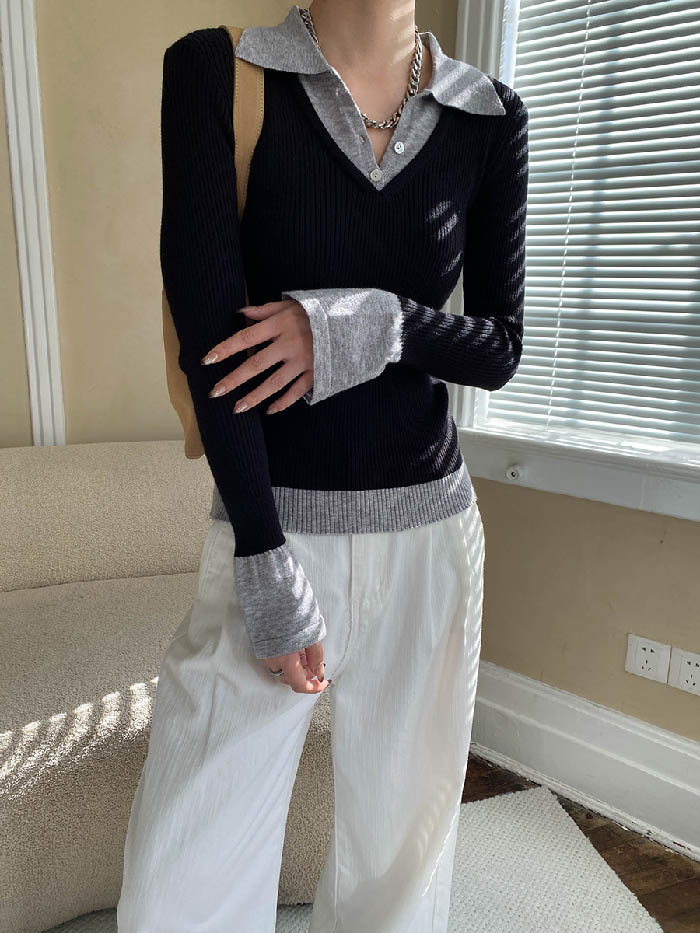 ニット 切り替え レディース 春 秋 長袖 カットソー 切り替えニット 重ね着 レイヤード風 シャツ ニット 長袖 フレア袖 トップス カットソー ブラウス 着瘦せ ゆったり オシャレ