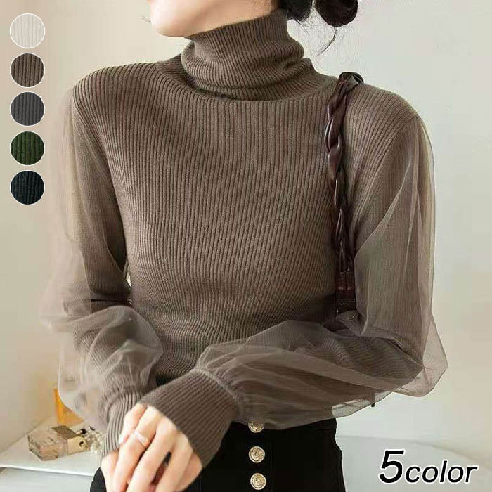 リブニット ニット レディース ハイネック インナー チュール袖 春 秋 トップス タイト ベーシック シャツ リブニット チュール 切り替え カットソー インナーニット タートルネック