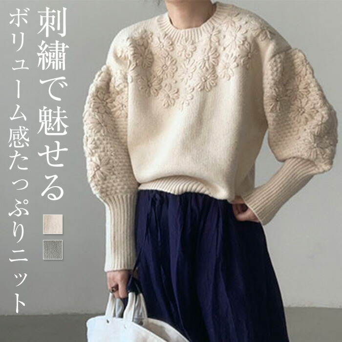 ニット セーター レディース 春 秋 長袖 セーター 立体感刺繡 花柄 トップス カットソー きれいめ お洒落 フェミニン 着回し シンプル カジュアル 体型カバー 柔らかい 暖かい オシャレ