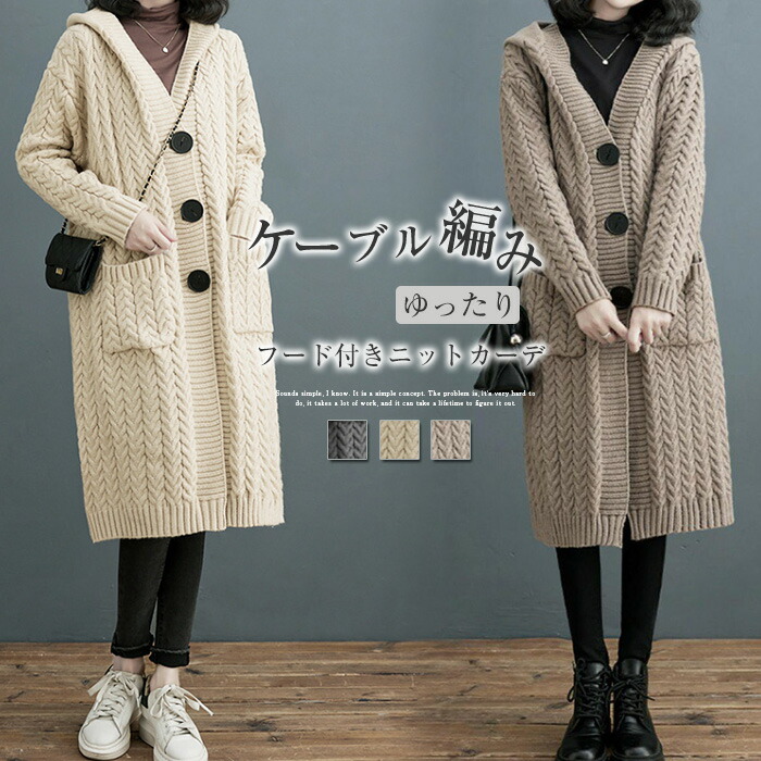 コート レディース フード付き ニット コート 春 秋 ニット カーディガン ケーブル編み アウター ロングコート ロング丈 ニット ジャケット 切り替え 大きいサイズ 大人 ゆったり