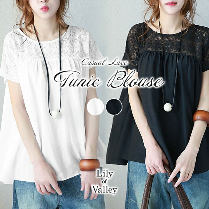 甘くなりすぎないカジュアルなフラワーレースが旬 胸元レース 切り替え チュニック 半袖 シャツ レディース トップス ブラウス カットソー ロング丈 ゆったり シャツ シアー 夏