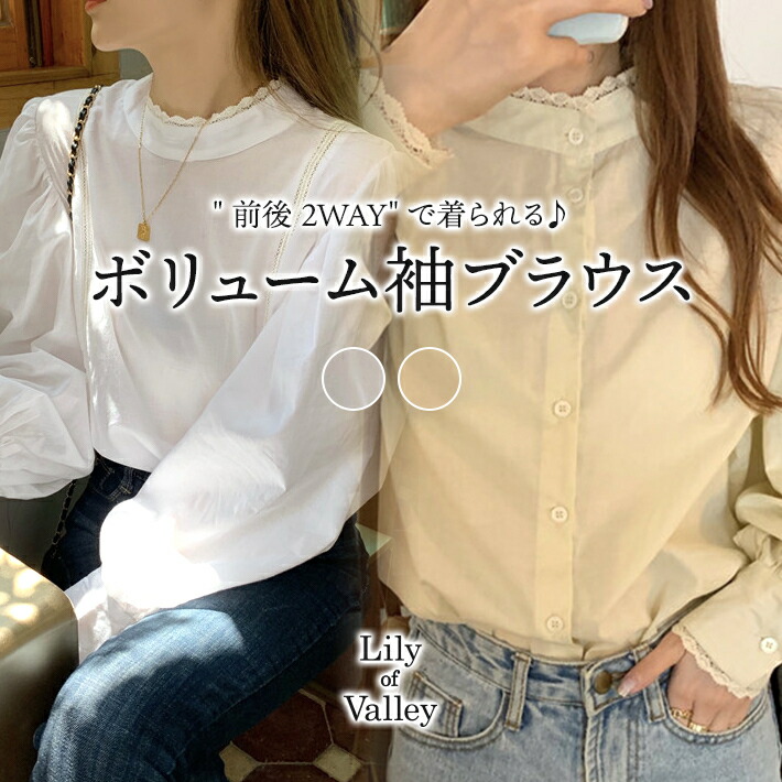 華やかな女性らしさが際立つ レース ドッキング 2WAY ボリューム スリーブ ブラウス レディース トップス スタンドカラー バルーン袖 パフ袖 韓国 オフィスカジュアル シャツ 白
