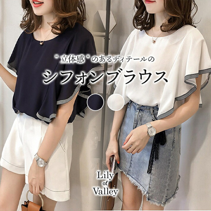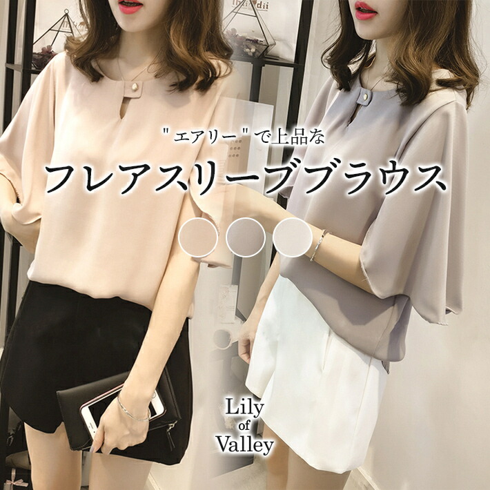 きちんと感漂うエアリーな上品トップス フレア フリル スリーブ シフォン ブラウス レディース トップス 半袖 無地 5分袖 ゆったり ボリューム袖 シアー 袖コンシャス 清楚 上品