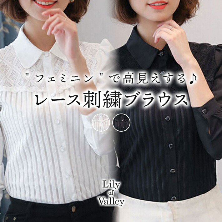 フェミニン×きちんと感が高見えする レース 刺繍 パフスリーブ ブラウス レディース ストライプ 長袖 無地 パフ袖 フォーマル オフィスカジュアル 韓国 事務服 パーティー 結婚式