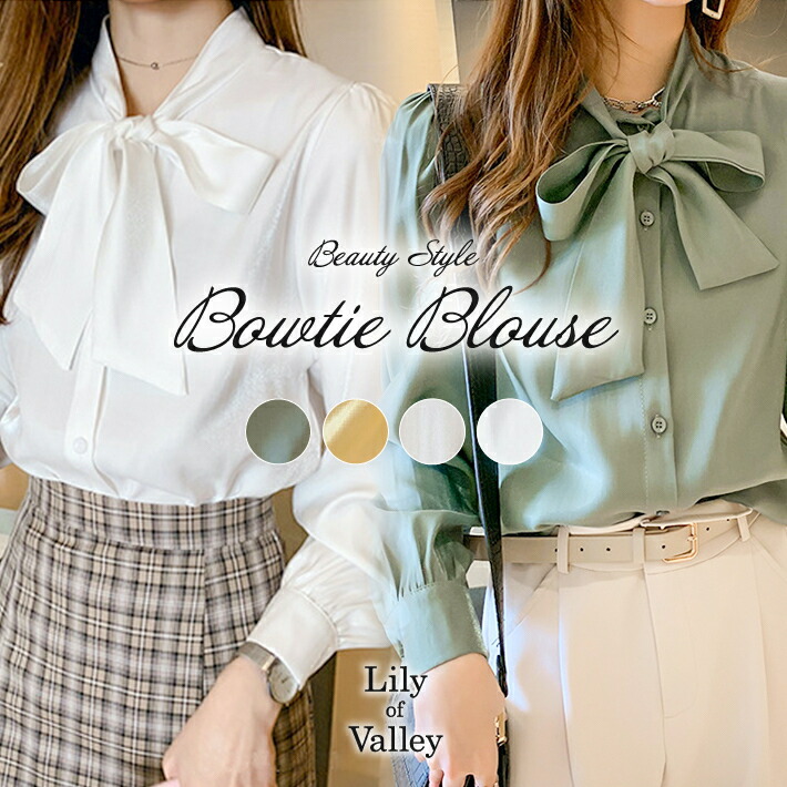 エレガントな雰囲気漂う☆美シルエ ボウタイ 無地 ブラウス シャツ リボンタイ バルーン袖 ボリューム袖 オフィスカジュアル 冬秋春夏 大きいサイズ 事務服 きれいめ 清楚 ハイネック