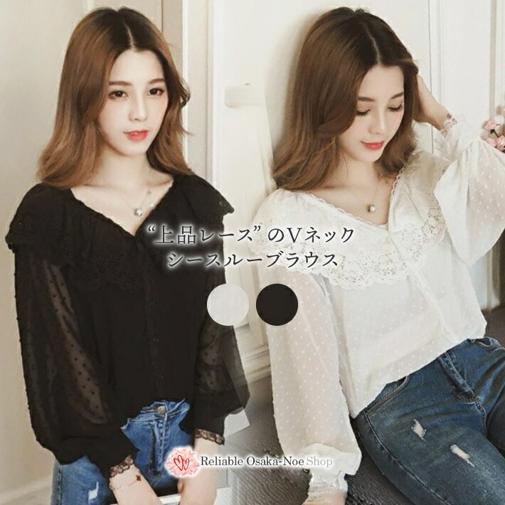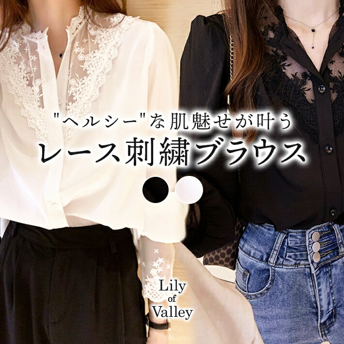 フェミニンなベビードット柄とトレンドのボリュームスリーブで大人可愛さ満点♪花柄 レース シャツ ブラウス 刺繍 シースルー 袖ボリューム 長袖 カジュアル 白 黒 ホワイト ブラック