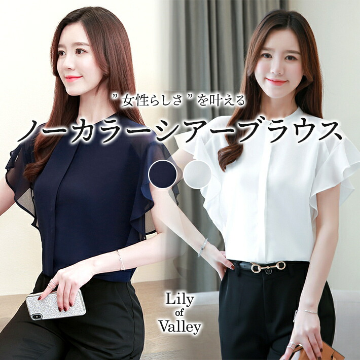 女性らしい着こなしを叶える上品トップス フリルスリーブ ノーカラー シアー ブラウス レディース トップス フレンチ 無地 シフォン ボリューム袖 フォーマル 事務服 清楚 上品
