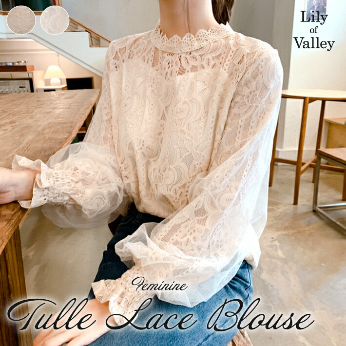 ヘルシーな肌魅せで上品な抜け感☆総レース チュール キャンディースリーブ ブラウス レディース トップス ボリューム袖 きれいめ カジュアル 花柄 刺繍 スカラップ シャツ 春 夏 秋