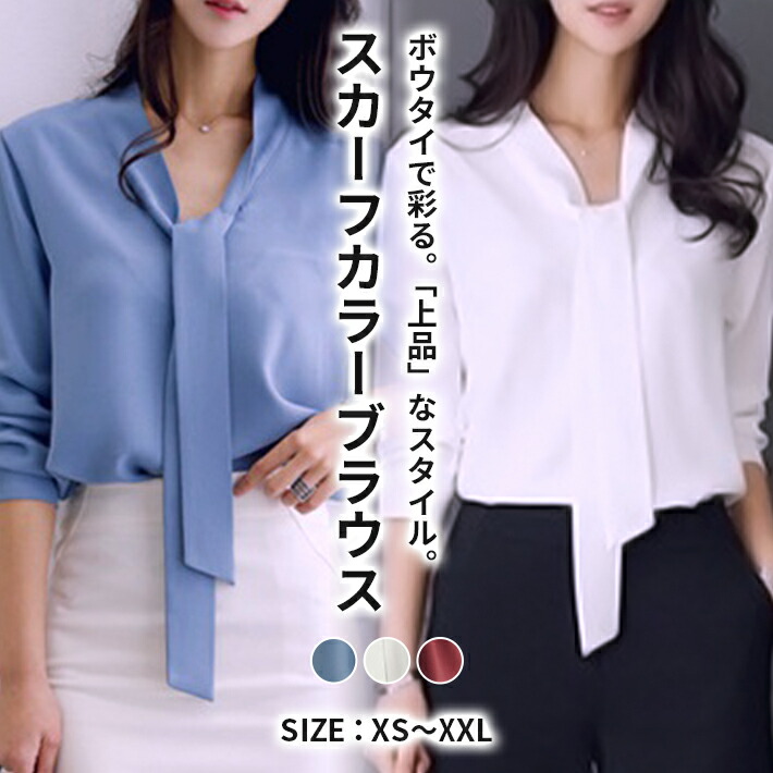 リボンとブラウスのコーディネートが、きれいめな大人女性を演出♪ボウタイシフォン シャツブラウス フォーマル オフィス 通勤 仕事 春夏 秋冬 白 ホワイト ワインレッド ブルー