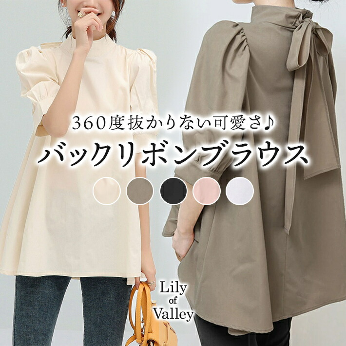 360度抜かりの無い可愛さが魅力の バックリボン ハイネック フレア ブラウス レディース 半袖 チュニック モックネック ゆったり パフスリーブ オフィスカジュアル ボリューム袖