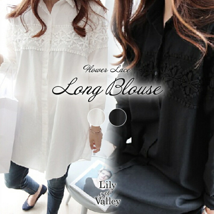 シーズンムードを盛り上げる☆刺繍 レース 切り替え ロング シャツ トップス 白 黒 ホワイト ブラック チュニック ブラウス ワンピース ゆったり 秋 冬 春 夏 大人可愛い 清楚 襟付き