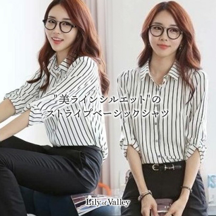 1着は持っておきたい万能アイテムの シンプル ストライプ ベーシック ブラウス レディース 清楚 襟付き 柄 フォーマル オフィスカジュアル 大きいサイズ お呼ばれ 韓国 Yシャツ