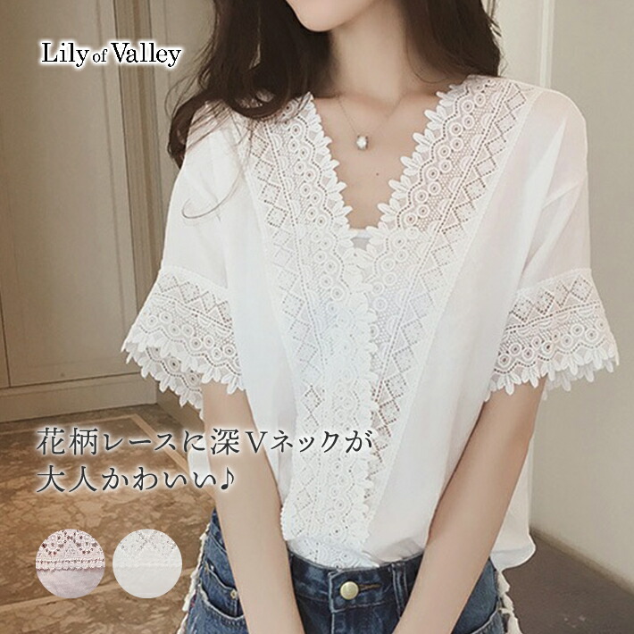花柄レースに深Vネックが大人かわいい♪ フラワー 刺繍 シャツ カットソー トップス スカラップ 薄手 シースルー 透け感 カットワーク 春 夏 秋 韓国 上品 清楚 白 ホワイト ピンク