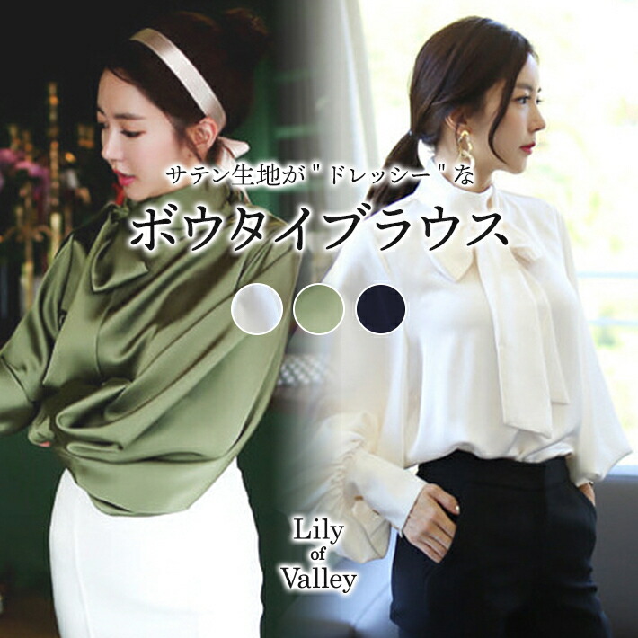 華やかな女性らしさが際立つ1品 サテン ボリュームスリーブ ボウタイ ブラウス レディース シャツ ふんわり ゆったり オフィスカジュアル バルーン袖 無地 リボン 結婚式 二次会