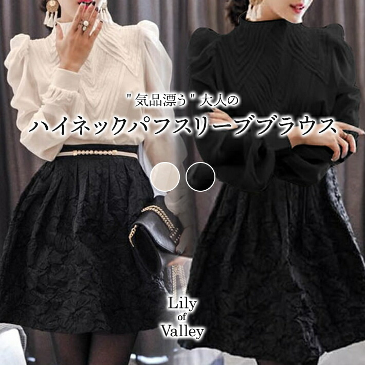 気品漂う大人のドレッシースタイル ハイネック パフスリーブ シアー ブラウス レディース シャツ ふんわり ボリュームスリーブ パフ袖 シフォン 韓国 無地 刺繍 パーティー 結婚式