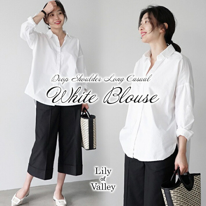 トレンドのオーバーサイズで抜け感たっぷり♪ビッグ シルエット ドロップショルダー 白 シャツ ロングシャツ 大きいサイズ 春 夏 秋 冬 長袖 ブラウス ボリュームスリーブ 無地 上品