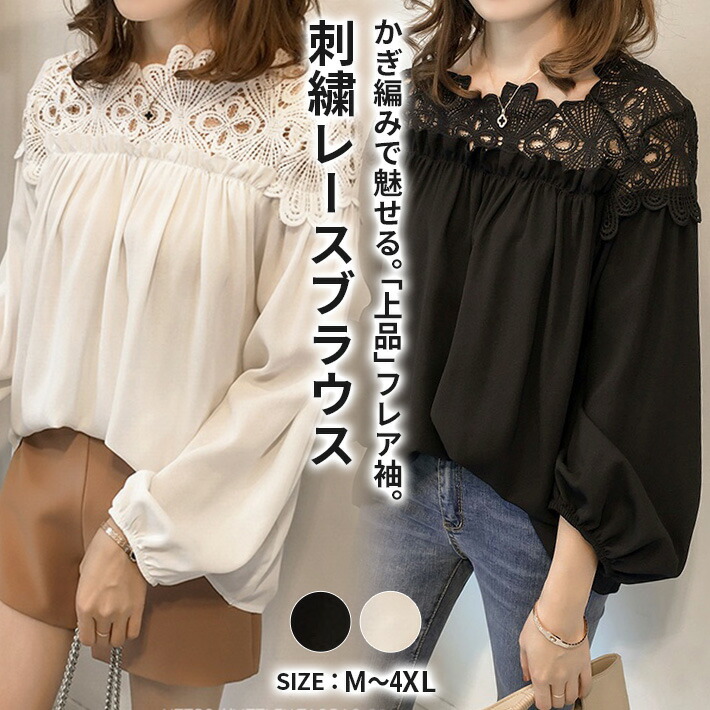 上品な肌魅せで今季使える♪かぎ編みフレア袖プルオーバー 大人 可愛い レース刺繍 長袖 フォーマル オフィスカジュアル ふんわり ゆったり スリーブ 大きいサイズ 春 夏 秋 冬 黒 白