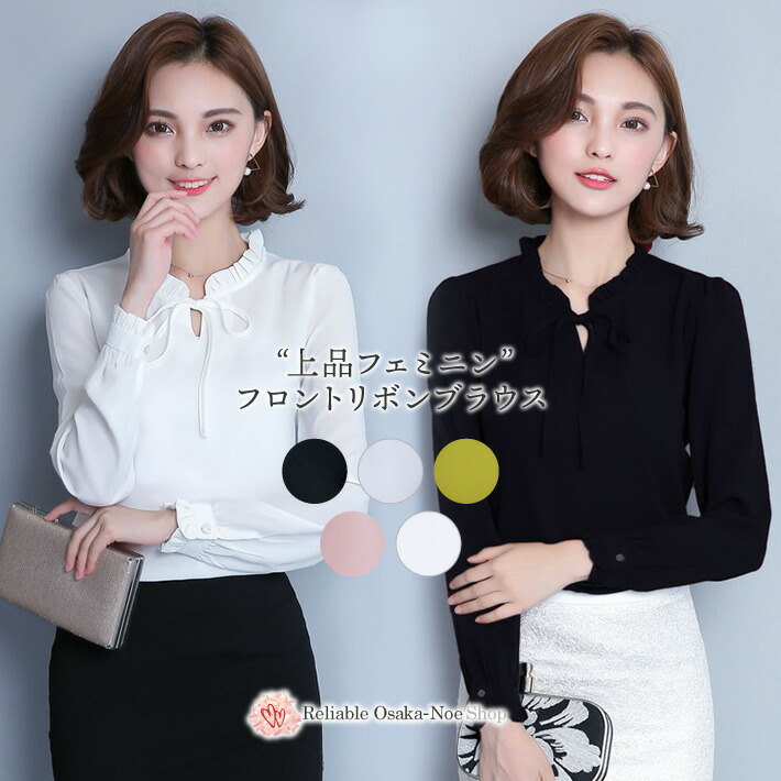 細身のリボンとフリルが上品で大人可愛い♪フォーマルでもカジュアルでも使える 長袖リボンブラウス シャツ オフィス 制服 事務服 立ち襟 とろみ フリル ボウタイ 通勤 オフィス