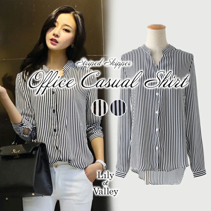 後ろに落とした襟抜きスタイルが今年らしい♪ デザイン ストライプ スキッパー ブラウス レディース トップス ボーダー Vネック ノーカラー カットソー ロング シャツ 清楚 春 夏