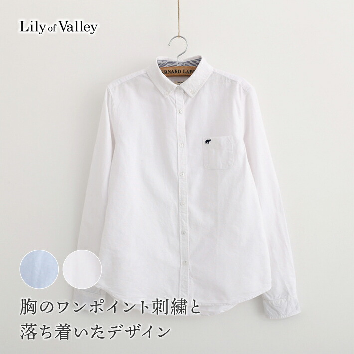胸のワンポイント刺繍と落ち着いたデザインが特徴の長袖オックスフォードシャツ ブラウス ボタンダウン カジュアル オフィス きれいめ 清楚 森ガール レトロ 春 夏 秋 冬 白 水色
