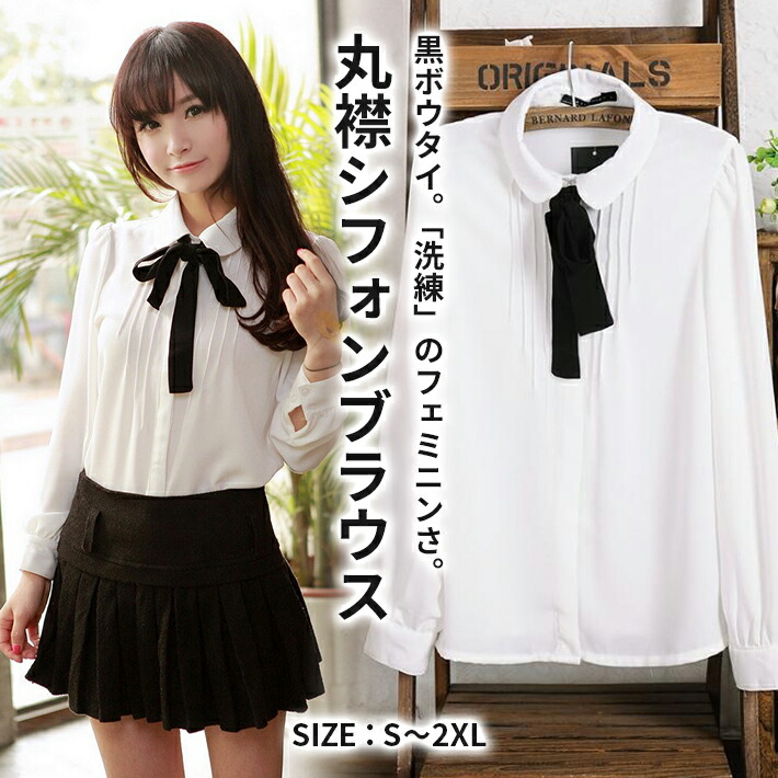 おしゃれ可愛い黒のボウタイ付き♪ 長袖 シフォン の ブラウス シャツ 丸襟 リボンタイ リボン 森ガール 上品 制服 カジュアル 大きいサイズ フォーマル パーティー 演奏会 演奏会