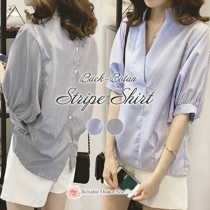 爽やかなストライプ柄と、さりげなくオシャレなバックボタンのデザインが大人かわいい♪半袖シャツ ブラウス レデイース ブラウス スキッパー Vネック ロング スタンドカラー 春 夏