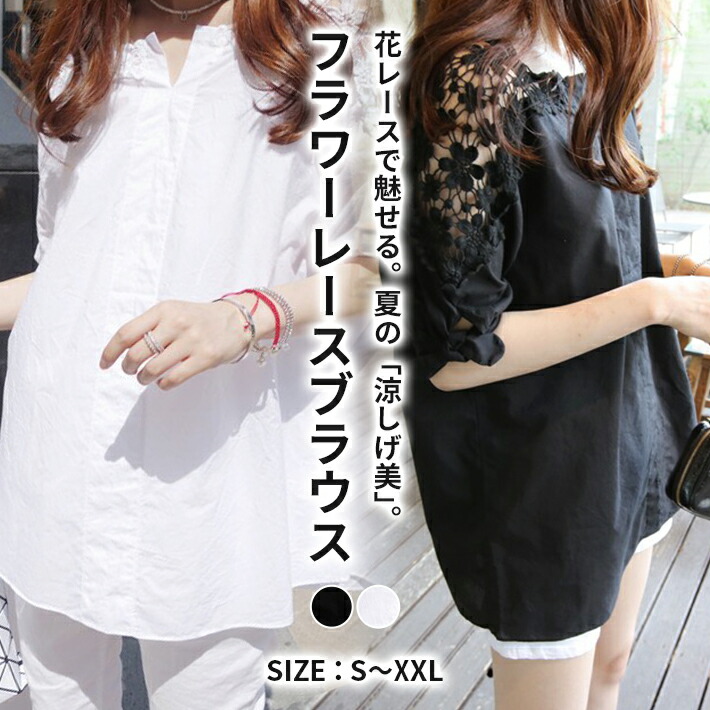 肩から襟までの花柄レースがオシャレ可愛い♪半袖ブラウス シャツ レディース トップス カットソー チュニック ノーカラー 刺繍 Vネック 抜き襟 肩だし 韓国 白 黒 春 夏 春夏