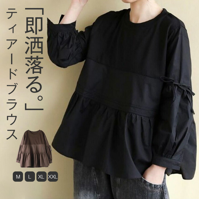 ブラウス 切り替え 春 秋 カットソー シャツ ブラウス ボリューム袖 トップス ライン 長袖 異素材切り替え シンプル カジュアル 大きいサイズ 体型カバー 着痩せ きれいめ ゆったり