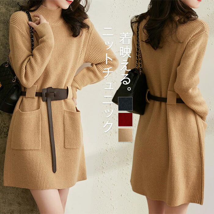 チュニック ニット レディース セーター チュニック ハイネック 秋 冬 長袖 ニットチュニック トップス カットソー きれいめ お洒落 フェミニン 着回し ニット ベルト付き 厚手 シンプル