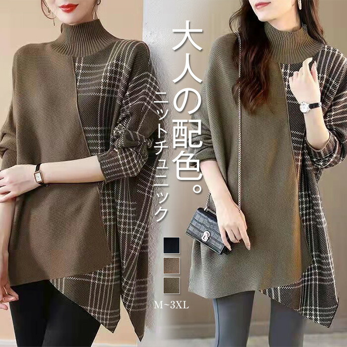 チュニック ニット レディース セーター チュニック ハイネック 秋 冬 長袖 ニットチュニック 切り替え トップス カットソー きれいめ お洒落 フェミニン 着回し ニット 厚手 シンプル