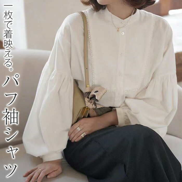 シャツ ブラウス レディース 春 夏 秋 長袖 シャツ バンドカラー トップス ボリューム袖 ぽわん袖 フェミニン 着回し シンプル おしゃれ 大人 カジュアル こなれ感 ゆったり ボリューム