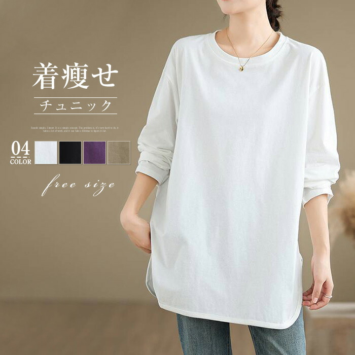 tシャツ プルオーバー レディース 春 秋 コットン 長袖 トップス Tシャツ 無地 シンプル ゆったり カジュアル 大きいサイズ ゆるっと ビッグシルエット 幅広カフス 着瘦せ お洒落