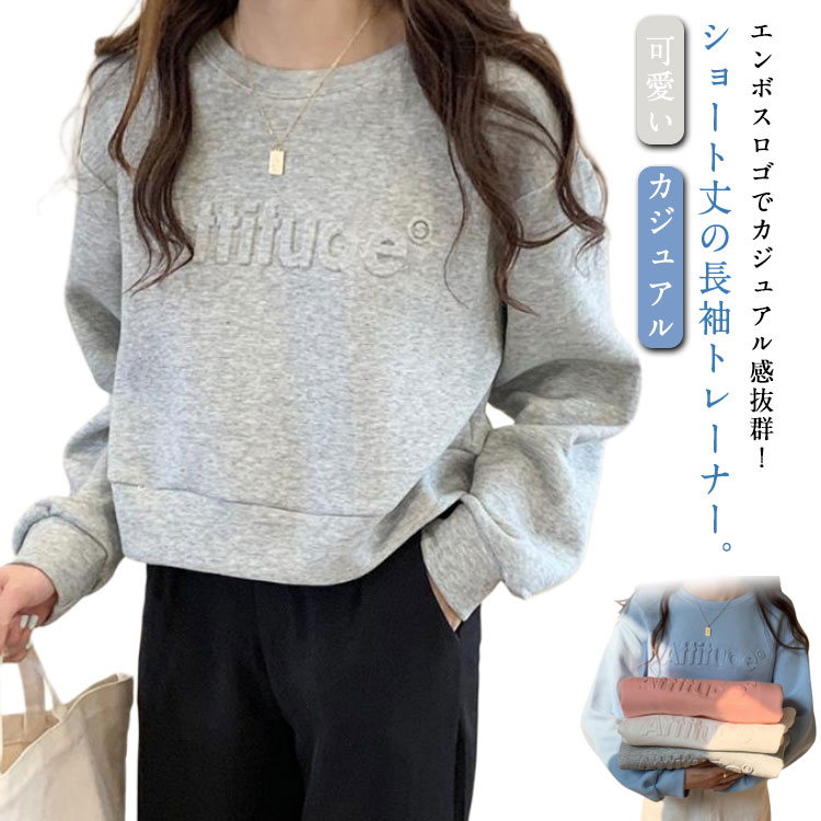 プルオーバー レディース ショート丈 長袖 トップ トレーナー パーカー tシャツ トップス スウェットパーカー かわいい 春秋 冬服 ゆったり エンボスロゴ