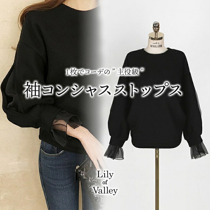 1枚で主役級間違いなしの袖コンシャストップス♪スリット シアー オーガンジー スリーブ スウェット トップス ボリュームスリーブ 袖コンシャス 無地 フリル 秋 冬 春 レース