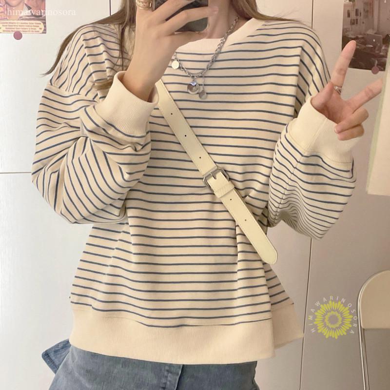 トレーナー レディース スウェット プルオーバー ストライプ クルーネック トップス ゆったり シャツ 長袖 カジュアル 薄手 春秋 通勤 学生 おしゃれ