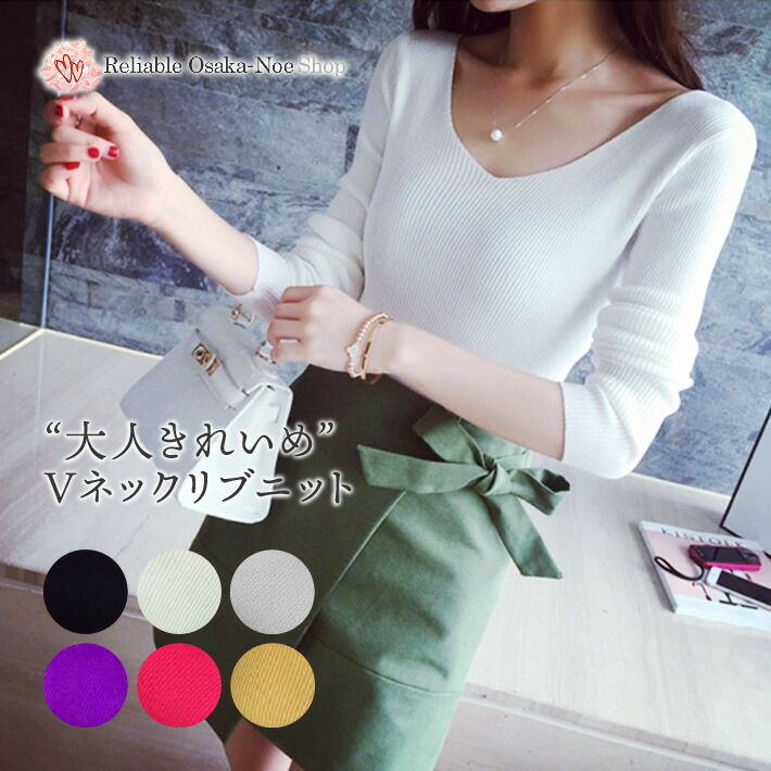 Vネック&リブ素材が大人きれいめな印象♪ Vネック リブ編み ニット セーター レディース トップス カットソー 長袖 上品 きれいめ セクシー 白 赤 紫 グレー 黒 黄 秋 冬 春 秋冬