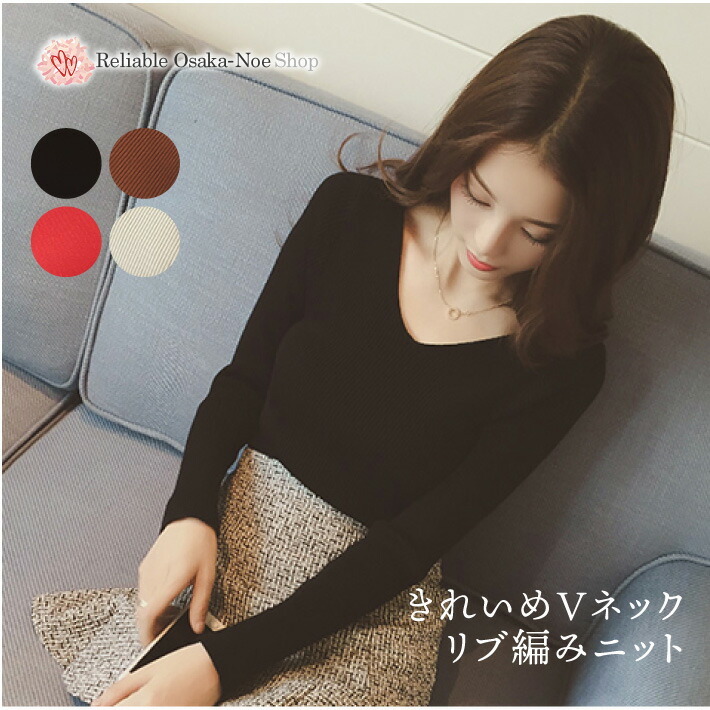 ネック&リブ編みのデザインが大人きれいめな印象を♪ Vネック リブ編み ニット セーター レディース トップス 長袖 上品 きれいめ 秋 冬 春 白 黒 赤 ブラウン