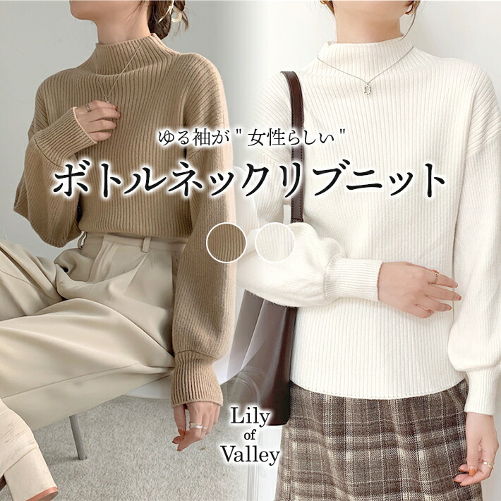 ぽわんとしたゆる袖が女性らしい ボトルネック パフスリーブ リブ ニット トップス レディース セーター ボリューム袖 ゆったり オフィスカジュアル きれいめ オーバーサイズ 秋冬