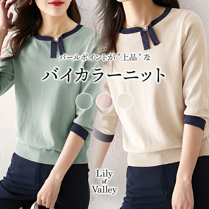 女っぽさがたっぷり詰まった上品トップス パールポイント バイカラー ハイゲージ ニット レディース カットソー ツートン オフィス オフィスカジュアル 清楚 カジュアル リボン