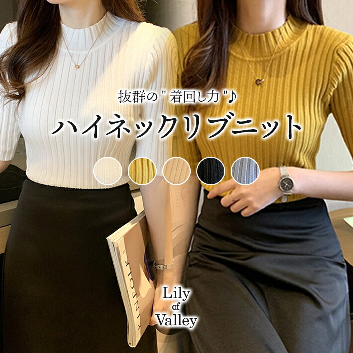 抜群の着回し力でヘビロテ確実のアイテム 五分袖 ハイネック ベーシック リブ ニット レディース オフィスカジュアル きれいめ 清楚 半袖 カットソー 大人可愛い サマーニット