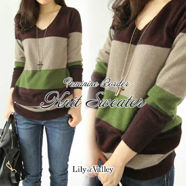 Vネックと3色ボーダー柄がとってもフェミニンな印象を♪マルチボーダー柄 長袖 セーター レディース トップス ハイゲージ ニット 大きいサイズ 暖かい あたたか 秋冬春