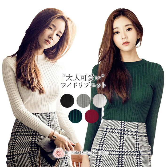太めのリブ編みと、クルーネックのデザインが、大人可愛い印象♪ ワイド リブ編み ニット セーター クルーネック 長袖 ニットソー 白 黒 グレー ワインレッド 緑