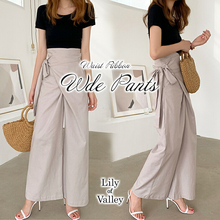 大人のこなれ感漂う☆ウエスト リボン リネン ラップ ワイド パンツ レディース ボトムス 上品 ライン タイト ひざ下 膝下 ミモレ丈 春 夏 麻 リネン ハイウエスト リゾート