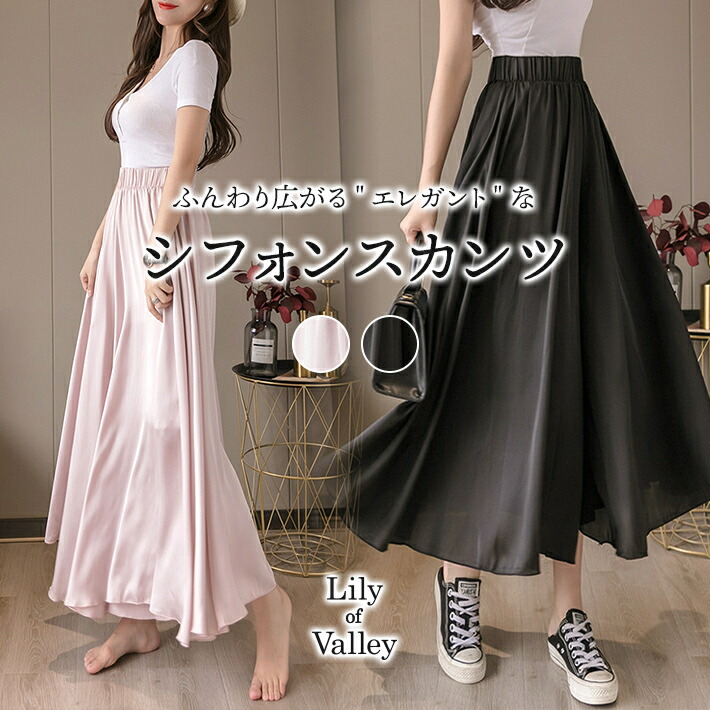 フレアシルエで細見え効果バツグン♪ウエストゴム フレア ロング シフォン スカンツ レディース ボトムス ガウチョ ロング丈 ワイドパンツ フレアスカート ミモレ 春夏 黒 ピンク